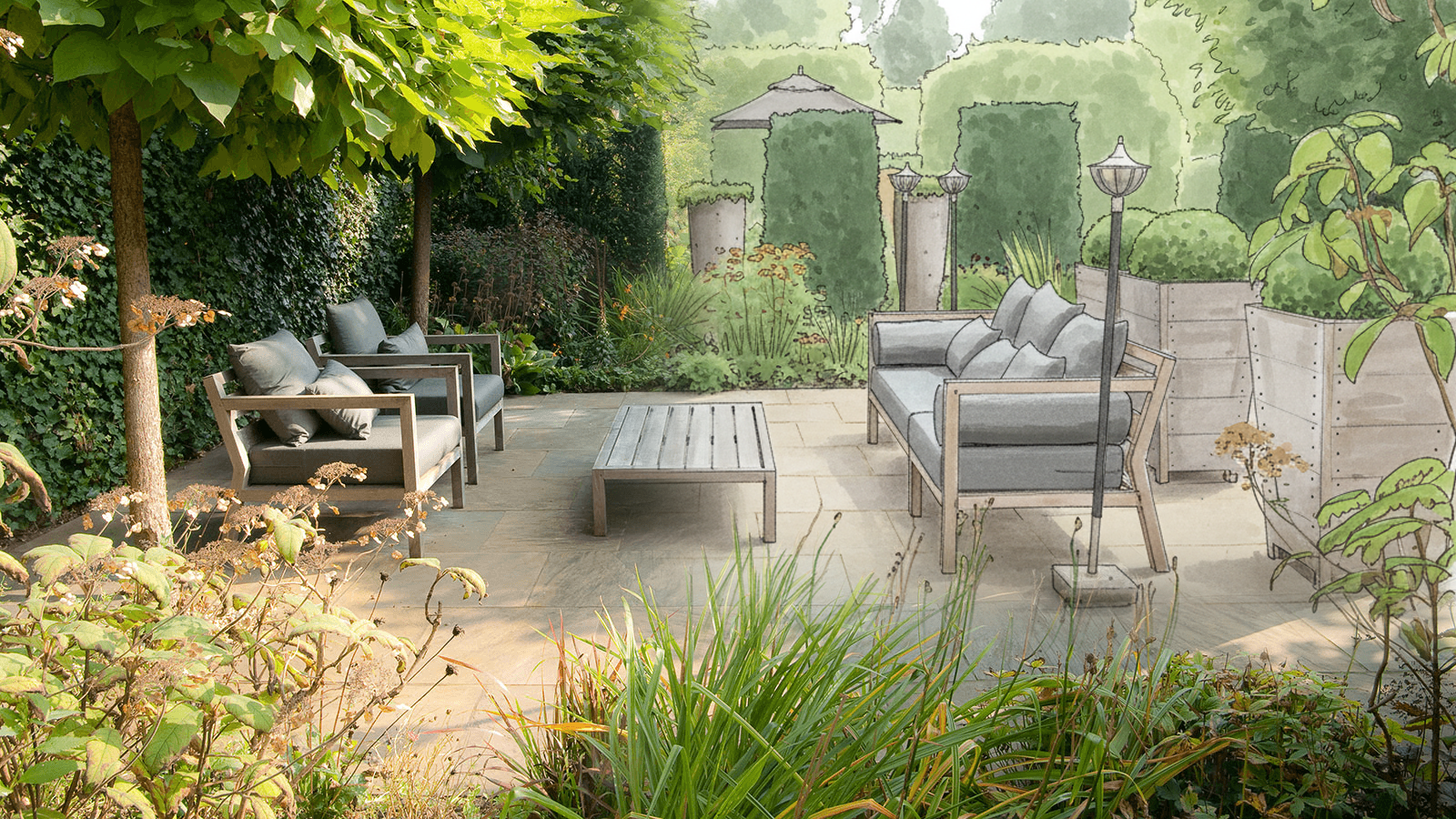 Portfolio Moderne tuin in Winterswijk Tuinontwerp, beplanting Moderne tuin in Winterswijk Tuinontwerp, 3D visualisatie Buitenkamer in Gendringen